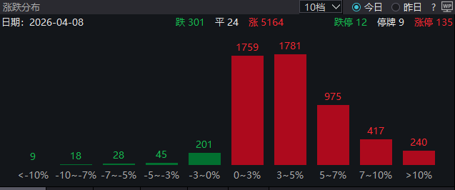 4月8日,A股也迎来强势反弹,沪指逼近4000点,创业板指暴涨近6%。量能明显放大,全市场超5100只个股上涨,其中135只个股涨停,连续两日超百股涨停。
