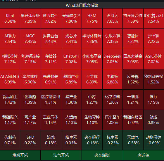 盘面上看,AI产业链核心爆发,软硬件方向齐头并进,大位科技、行云科技、奥瑞德、杭钢股份、华孚时尚等多股涨停。半导体设备、CPO、PCB等科技成长股集体大涨,中际旭创、新易盛、罗博特科等盘中创历史新高。