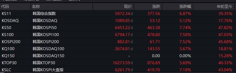受情绪提振,4月8日,亚太地区股市全线上涨,日韩股市领涨。截至收盘,日经225指数上涨5.39%,报56308.42点;韩国综合指数涨6.87%,报5872.34点。韩国交易所于KOSPI 200期货上涨5%后启动KOSPI指数熔断机制,程序化交易暂停5分钟。