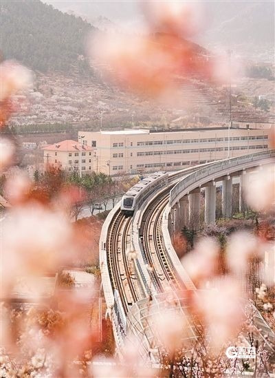 青岛地铁蓝谷快线在樱桃花海中穿行。