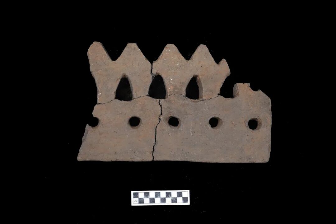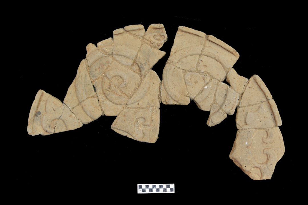 窑址出土大量建筑构件,包括板瓦、筒瓦、瓦当、砖及管道等,形制与山顶建筑第一期遗物一致,可确定这批陶窑是秦代砖瓦窑。所出夔纹大半圆瓦当当面图案与陕西秦始皇陵、栎阳城、辽宁姜女石秦行宫等遗址出土同类器一致,是秦代最高等级建筑的标准器,其中最大一件复原直径约80厘米。窑址区的发现不仅为遗址断代和分期提供了准确依据,还充分展现了中央集权下资源调配方式与标准化生产制度。