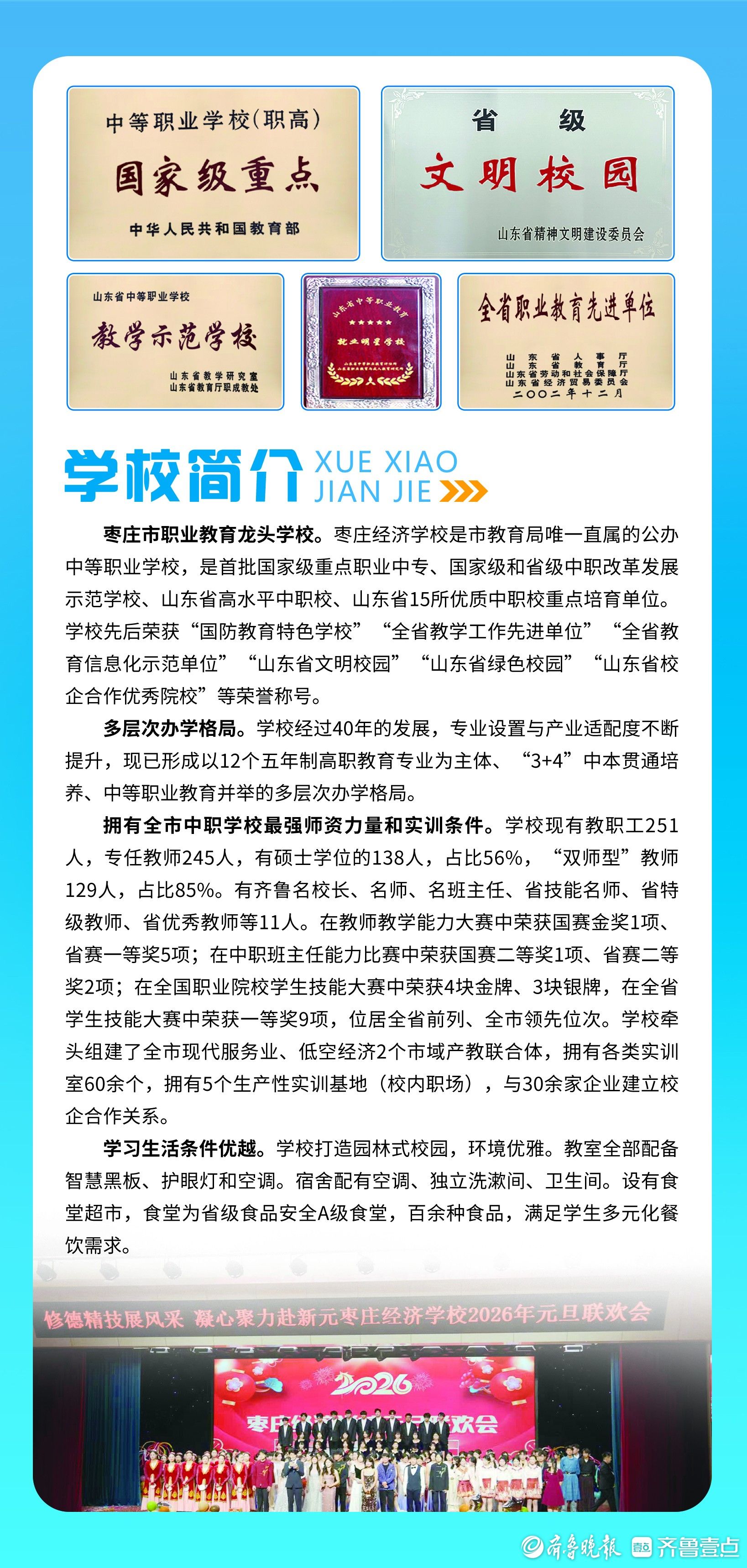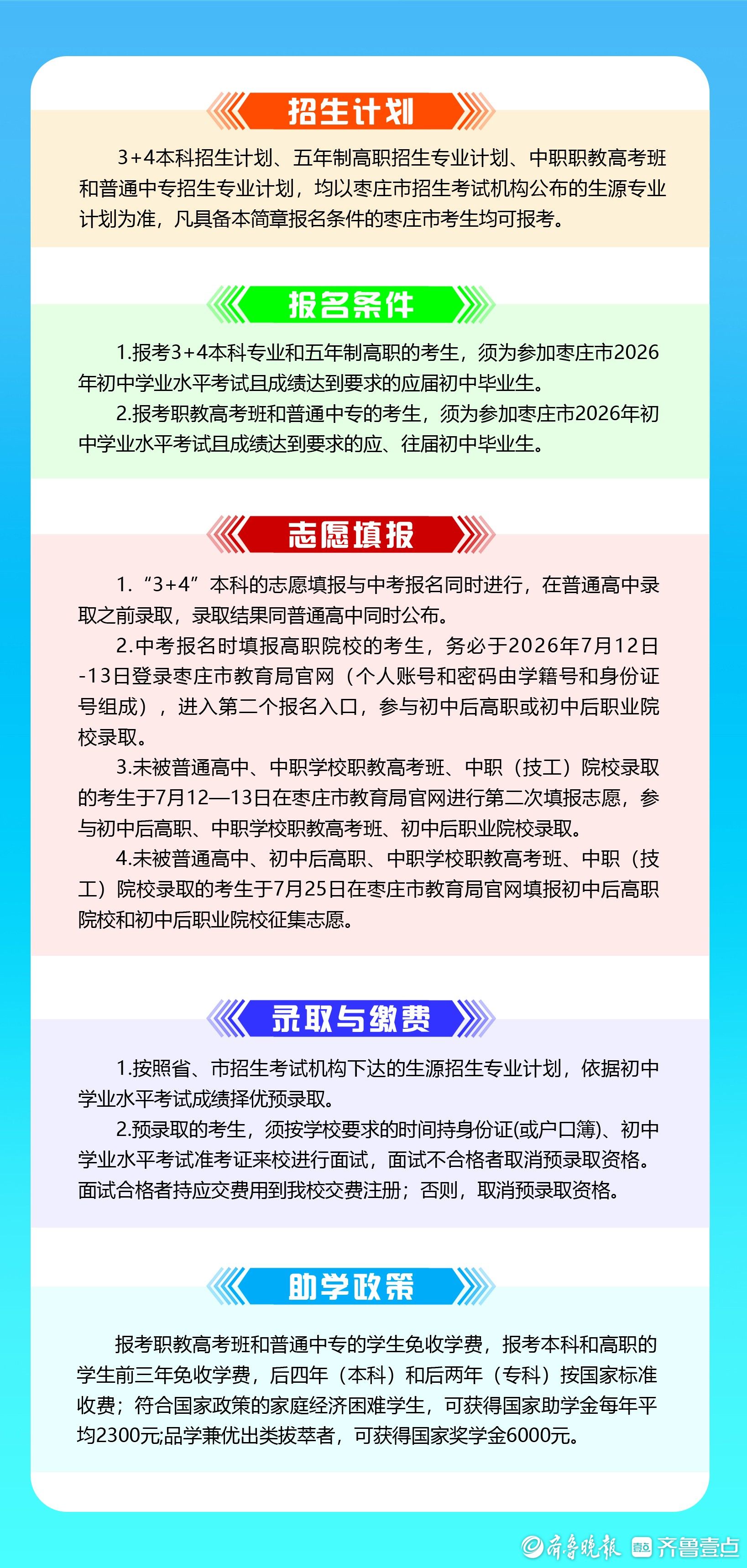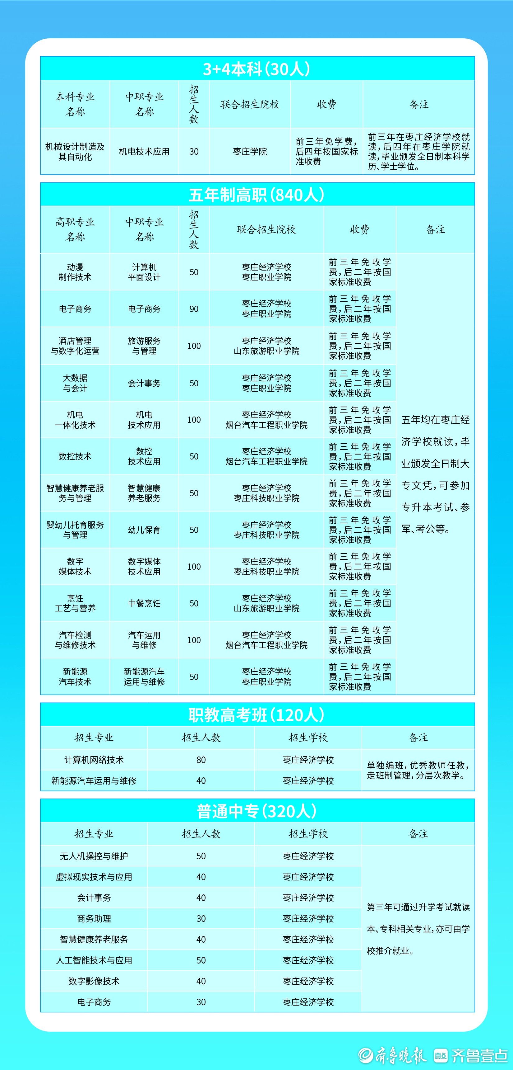 4月8日,枣庄经济学校2026年招生简章发布,计划招生1310人,其中“3+4”中本贯通专业招收30人,本科衔接枣庄学院。值得注意的是,"3+4"本科的志愿填报与中考报名同时进行,在普通高中录取之前录取,录取结果同普通高中同时公布。