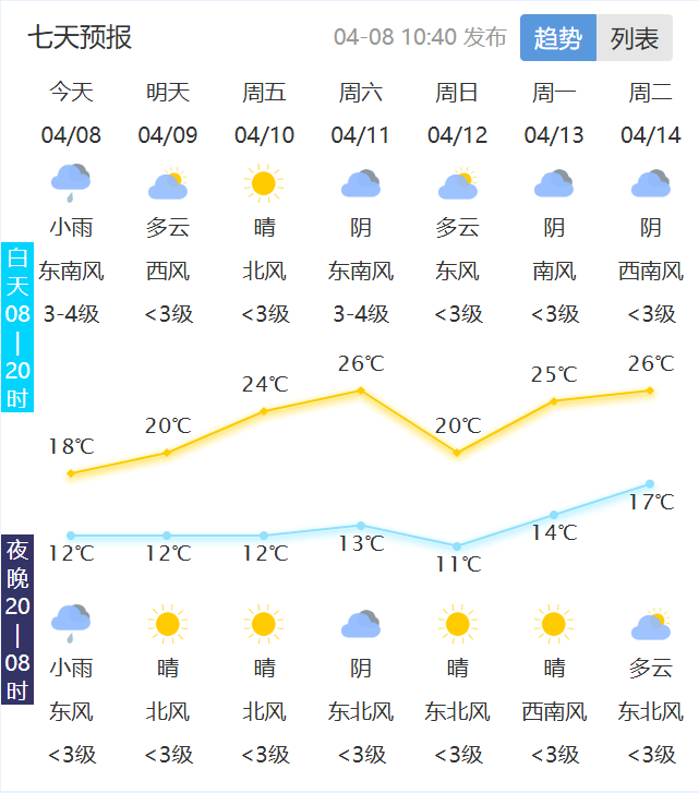 未来七天泰安天气预报泰安气象台4月8日上午发布泰安短期预报:白天到夜间,多云转阴有小到中雨并伴有雷电,南风转北风3到4级,湖面4到5级,雷雨地区雷雨时阵风7到8级,气温18度到12度。