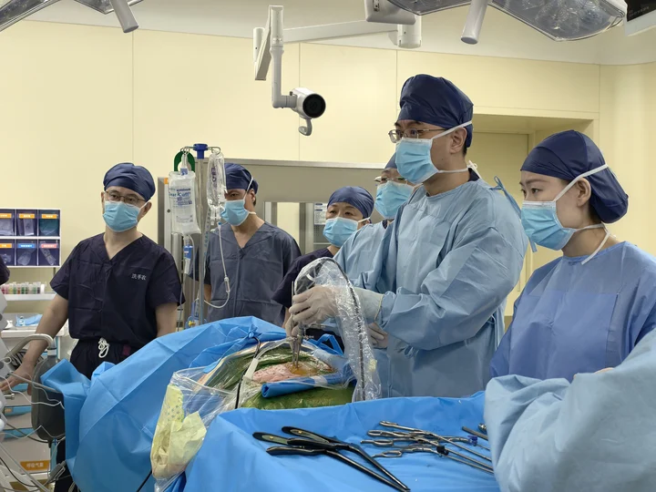 该手术为内镜下腰椎管狭窄减压+髓核摘除术(UBE),在10号手术间进行,由院长宁斌、副主任医师李健主刀,麻醉科医护团队紧密配合完成。与传统开放手术不同,该手术仅通过背部两个直径分别6毫米、8毫米的微创切口,借助专用器械与内镜系统完成操作。