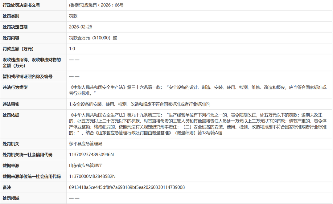 近日,东平县应急管理局对东平百成矿业有限公司作出行政处罚,该公司因安全设备相关环节不符合国家标准,被依法罚款人民币1万元整。