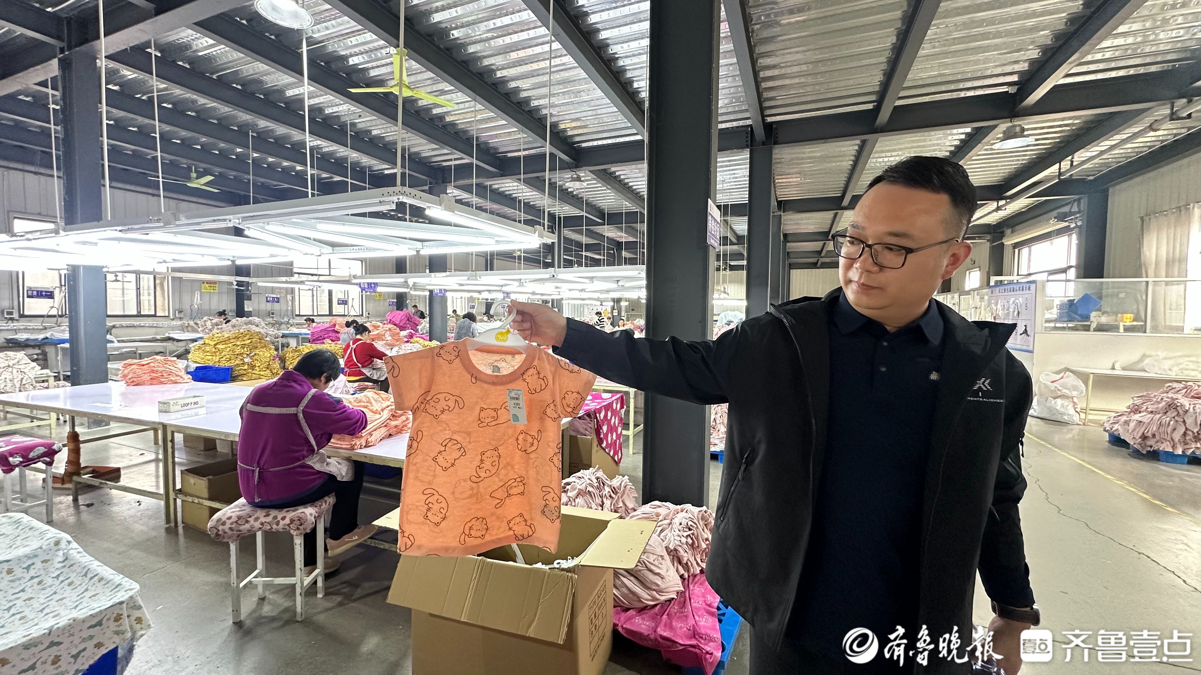 2009年,他在枣庄市市中区永安镇接了一个青岛人的日本外贸业务,干了十几年,2021年才搬到税郭镇建了新厂。现在厂子占地20亩,8条流水线,将近400号人,专门做婴儿到6岁儿童的针织服装。主要客户三个:美国的迪士尼、沃尔玛,日本的西松屋。
