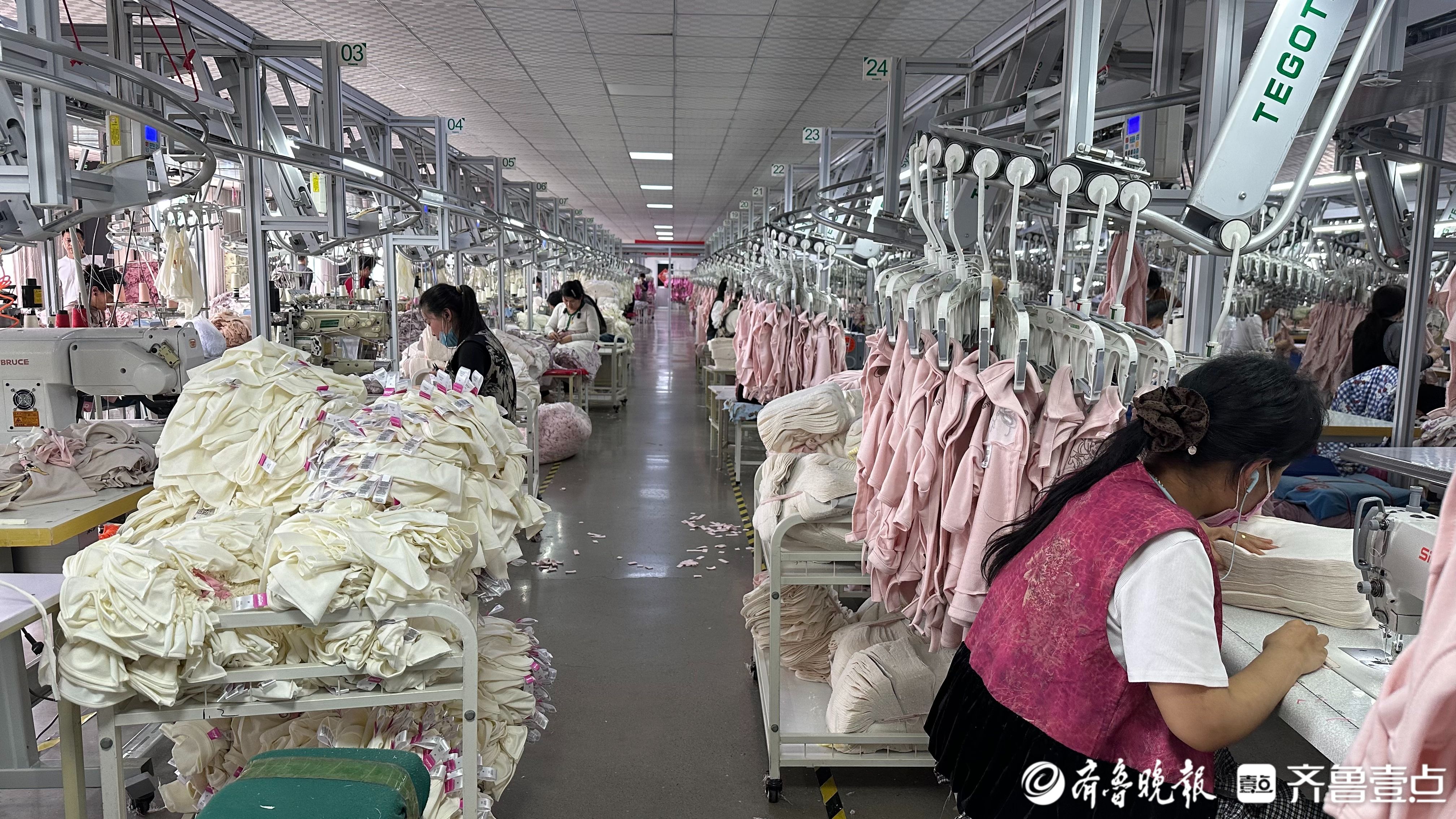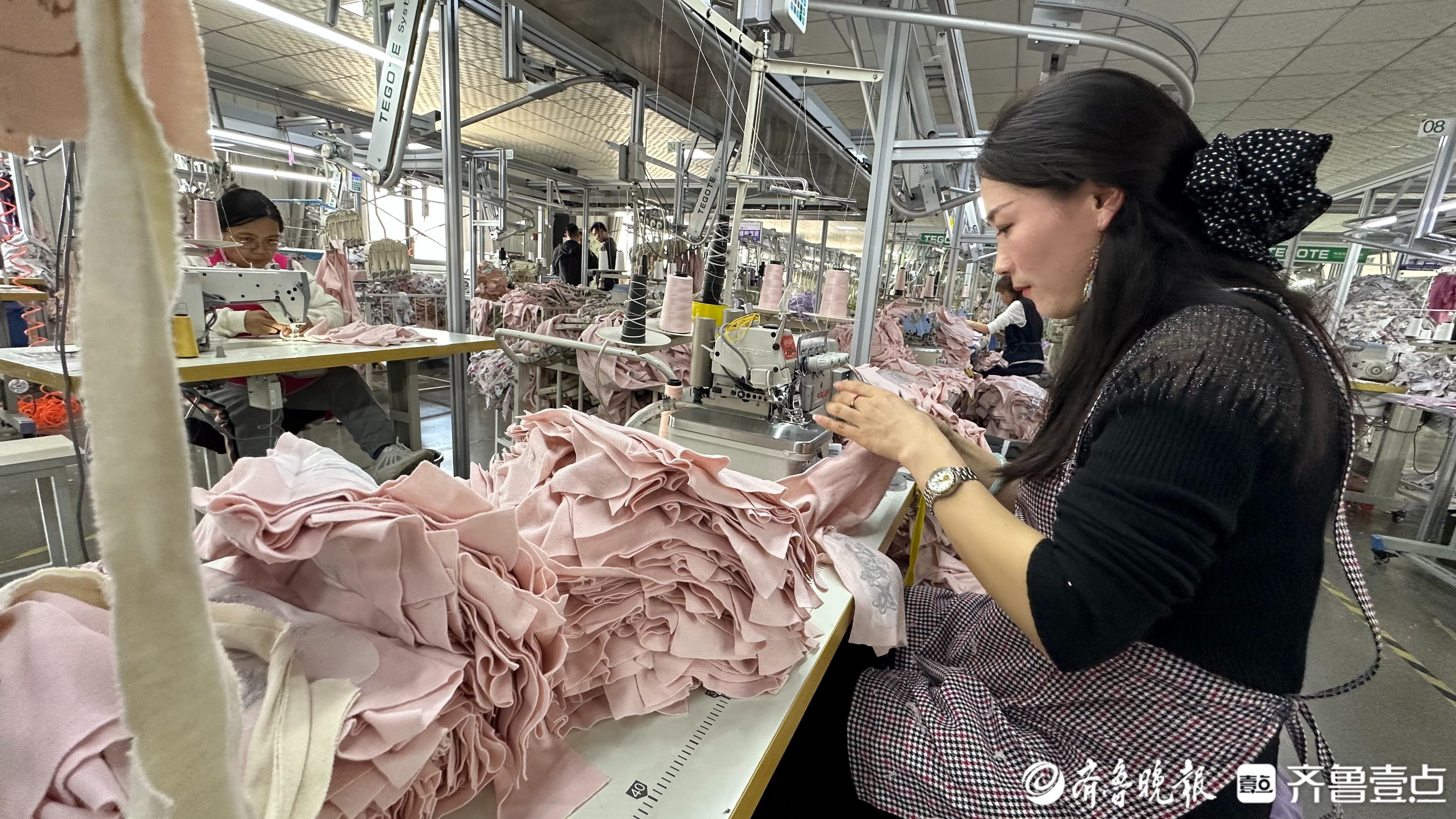 这里是枣庄市市中区税郭镇纺织工业园。山东天之娇纺织科技有限公司的车间里,织机嗡嗡转着,吊挂流水线上挂满半成品,工人们手脚不停。