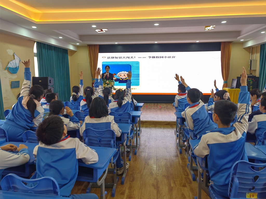 本次宣讲以“给成长穿上‘法律铠甲’——现实与网络世界的规则之旅”为主题。在现实世界篇,干警结合相关法律法规,通过虚拟人物小宇遭遇欺凌的系列场景,用浅显易懂的语言讲解了校园欺凌的表现形式及法律后果,并结合校园内经常发生的案例,讲解了未成年人侵权的民事责任。网络世界篇则聚焦网络诈骗、网络谣言、网络隐私保护等方面,详细剖析了网络诈骗套路及网上泄露隐私、传播谣言的后果。现场还设置了法律知识大闯关、情景剧场等互动环节,充分调动孩子们主动思考、踊跃答题的积极性,让大家在轻松愉快的氛围中学会分辨危险、保护自己,深刻认识到遵守法律和规则的重要性。