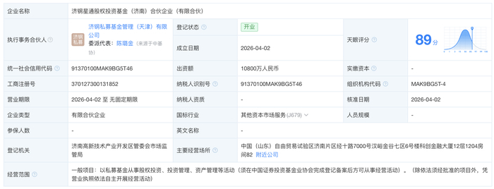 近日,济钢星通股权投资基金(济南)合伙企业(有限合伙)(以下简称“济钢星通基金”)正式完成工商注册,落地济南。济钢星通基金总认缴出资额达到1.08亿元,经营范围涵盖以私募基金开展股权投资、投资管理、资产管理等相关业务,是济南市属国企济钢集团在产业投资领域落下的又一关键棋子。
