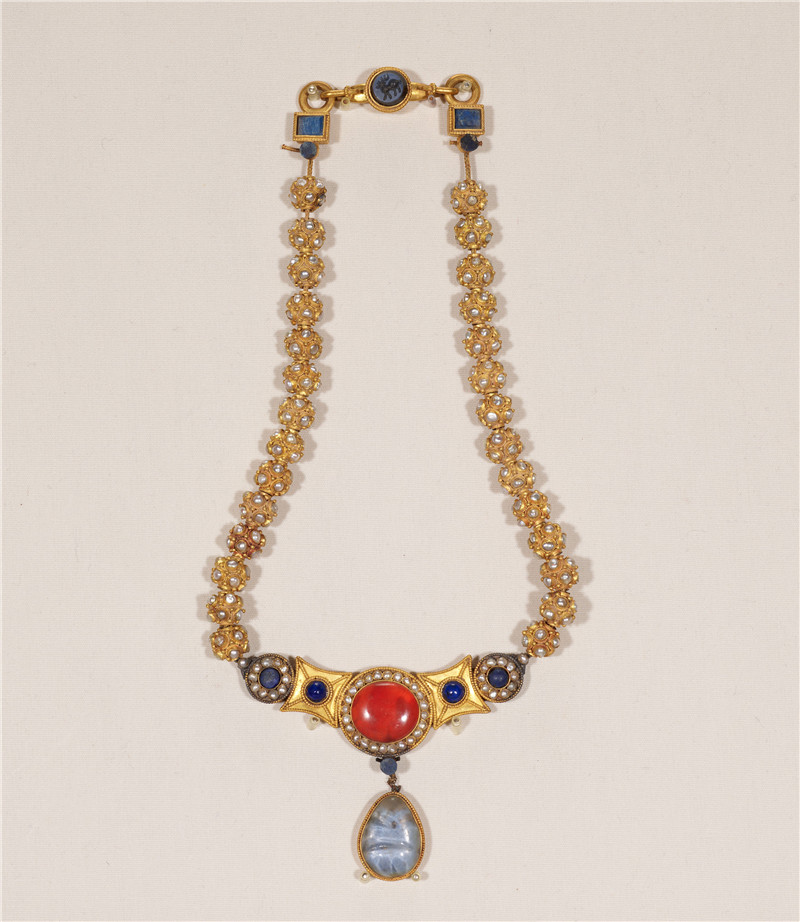 这条项链以黄金为主体,镶嵌红宝石、蓝宝石和珍珠,“一眼望去,光彩夺目”。然而,无论材质还是工艺,它都并非中国本土制品,产地可能位于今天的巴基斯坦、阿富汗一带,这里曾是历史上东西方文明交融汇聚的十字路口。项链两侧的28颗金珠,每颗由12个小金环焊接成空心多面体,又称“多面金珠”,这种设计可追溯到古希腊迈锡尼文明;小金环焊缝处的金粒装饰被称为“金粟”,早在四千多年前的两河流域就已出现;上端的青金石圆纽上雕刻着一只花角鹿,“鹿角又大又长,分叉展开,是典型的粟特样式”;宝石上的凹雕图案,也是古代西亚、中亚印章的常见形式。北朝时期,游牧民族入主中原,推动了中外文化的频繁交流。隋朝结束南北朝分裂局面、实现大一统后,更是着力经营丝绸之路,促进与西域的交往。一条项链,浓缩了古希腊、两河流域、中亚粟特、萨珊波斯艺术在欧亚大陆上交汇融合的轨迹。