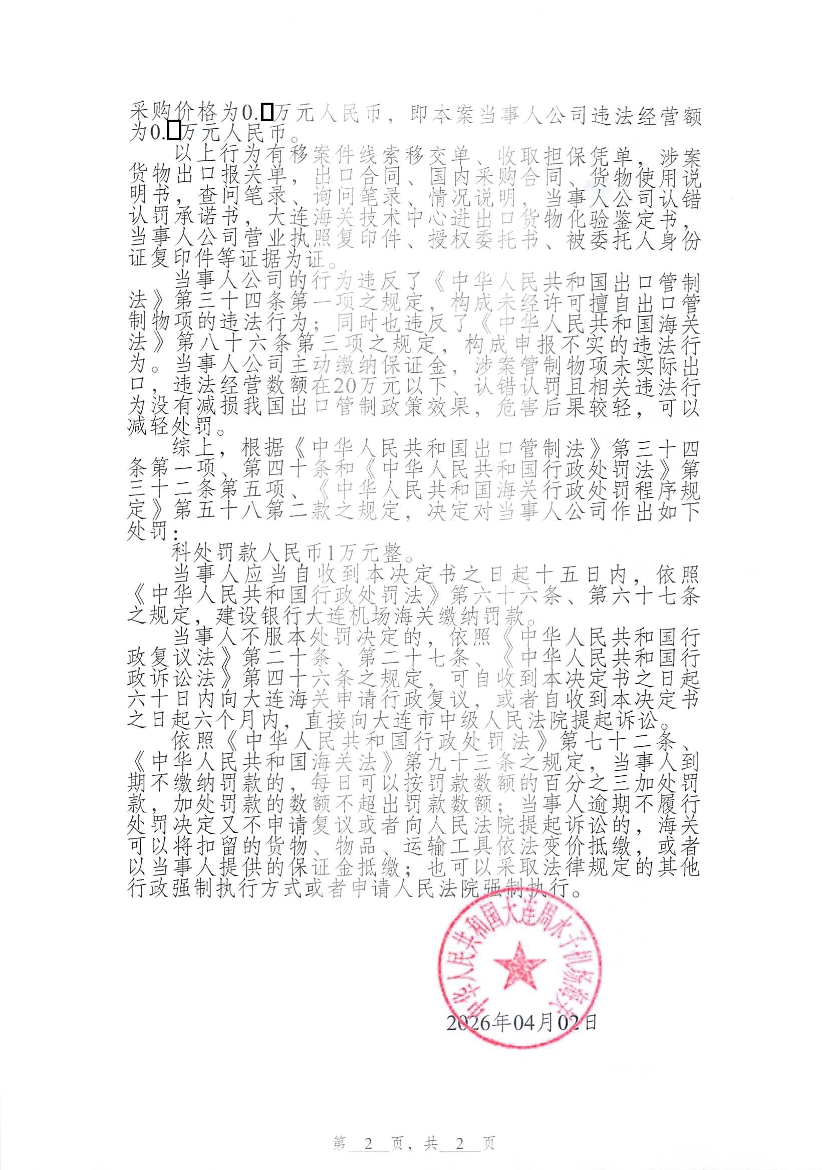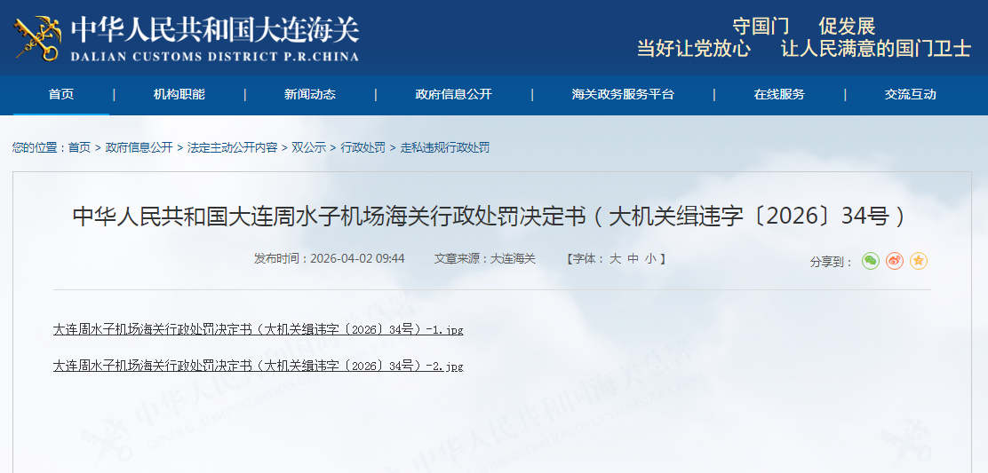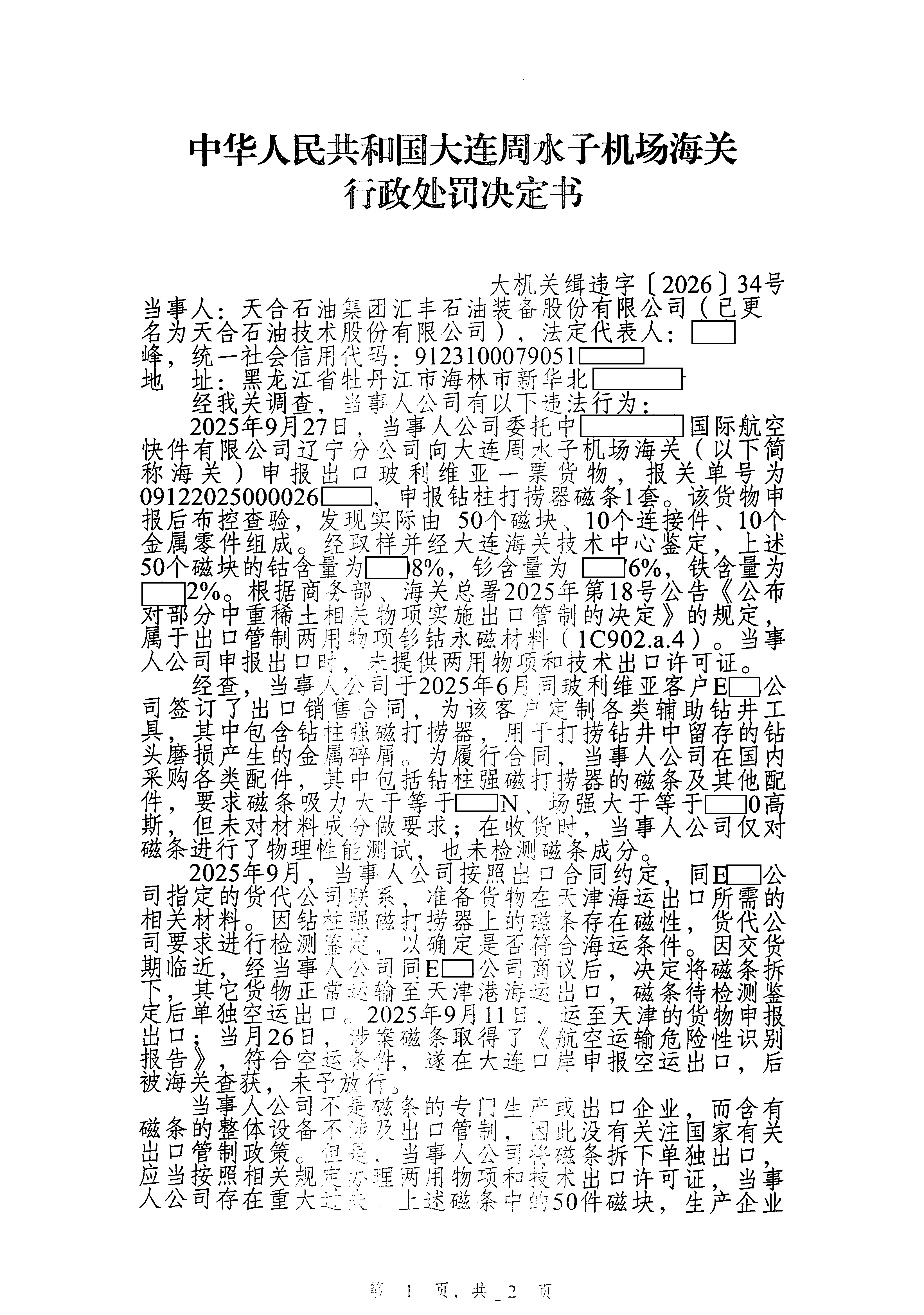 齐鲁晚报·齐鲁壹点记者于中华人民共和国大连海关“走私违规行政处罚”栏获悉,4月2日,该栏发布《中华人民共和国大连周水子机场海关行政处罚决定书(大机关缉违字〔2026〕34号)》,天合石油集团汇丰石油装备股份有限公司(已更名为“天合石油技术股份有限公司”,下称“天合石油”)被罚。