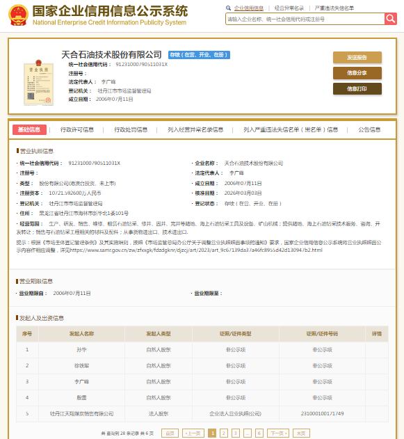国家企业信用信息公示系统显示,天合石油技术股份有限公司成立于2006年,注册资本10721.5926万元人民币,法定代表人李广峰,大股东为天合石油集团股份有限公司。2026年3月3日,其名称由天合石油集团汇丰石油装备股份有限公司,变更为天合石油技术股份有限公司。