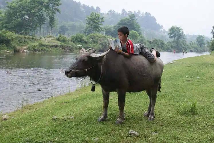 那时是抓着什么书看什么书,没什么计划和目的,读书也是囫囵吞枣,粗枝大叶的,不认识的字跳过去,不求甚解,看重的是故事情节。看到激情澎湃处,会手舞之足蹈之,或者大声朗诵一段,山有回音,仿佛是在应和我。反正一个人对着牛读书,没有人会看到我“疯癫”的样子。累了,就合上书,抬头看看悠闲吃草的牛儿,或者躺在草地上,听小鸟在树梢歌唱,看花儿在林间开放,看白云在天际飘荡……