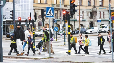 在瑞典斯德哥尔摩市中心,人们在自动信号灯的指示下过马路。本报记者 殷淼摄