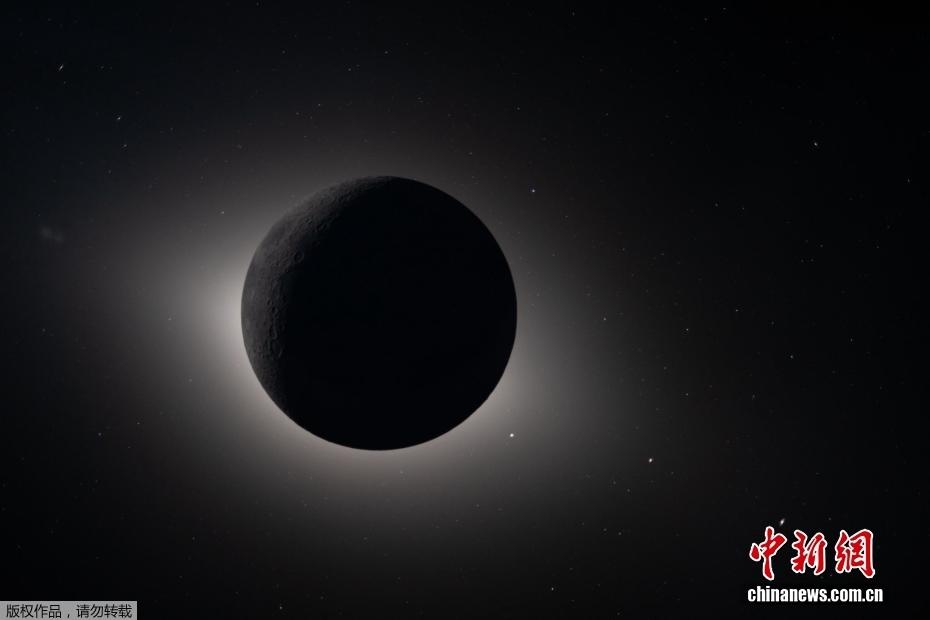 从“猎户座”飞船上拍摄到月球完全遮住太阳的景象。