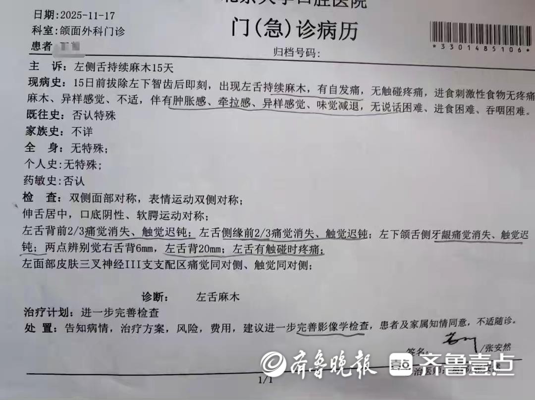 据王女士透露,由于要备孕,她想提前去把左下方的智齿拔掉,于2025年11月2日,她在焦作市山阳区找了一家口腔诊所就诊。“因为我在那家诊所补过牙,感觉还行,于是就直接去了,但我不知道拔牙还这么危险。”王女士表示,因为自己正在备孕,不能拍X光片,于是带过去一张几年前拍的片子去该诊所。主治医生告诉王女士,告知拔智齿“没有任何危险”,并且在得知她在备孕后,没有给牙齿拍X光片,便进行了拔除智齿的手术。“医生拔了半个小时之后,说难度挺大,于是又换了两个医生,前后忙了将近三个小时。”王女士表示,拔完之后自己便回家了,但当晚麻药劲儿过后,舌头没有任何知觉,“跟麻药劲儿没过一样,感觉嘴巴里的不是自己的舌头,能动能说话,但没有知觉,像是一团死肉!”王女士哭诉道。