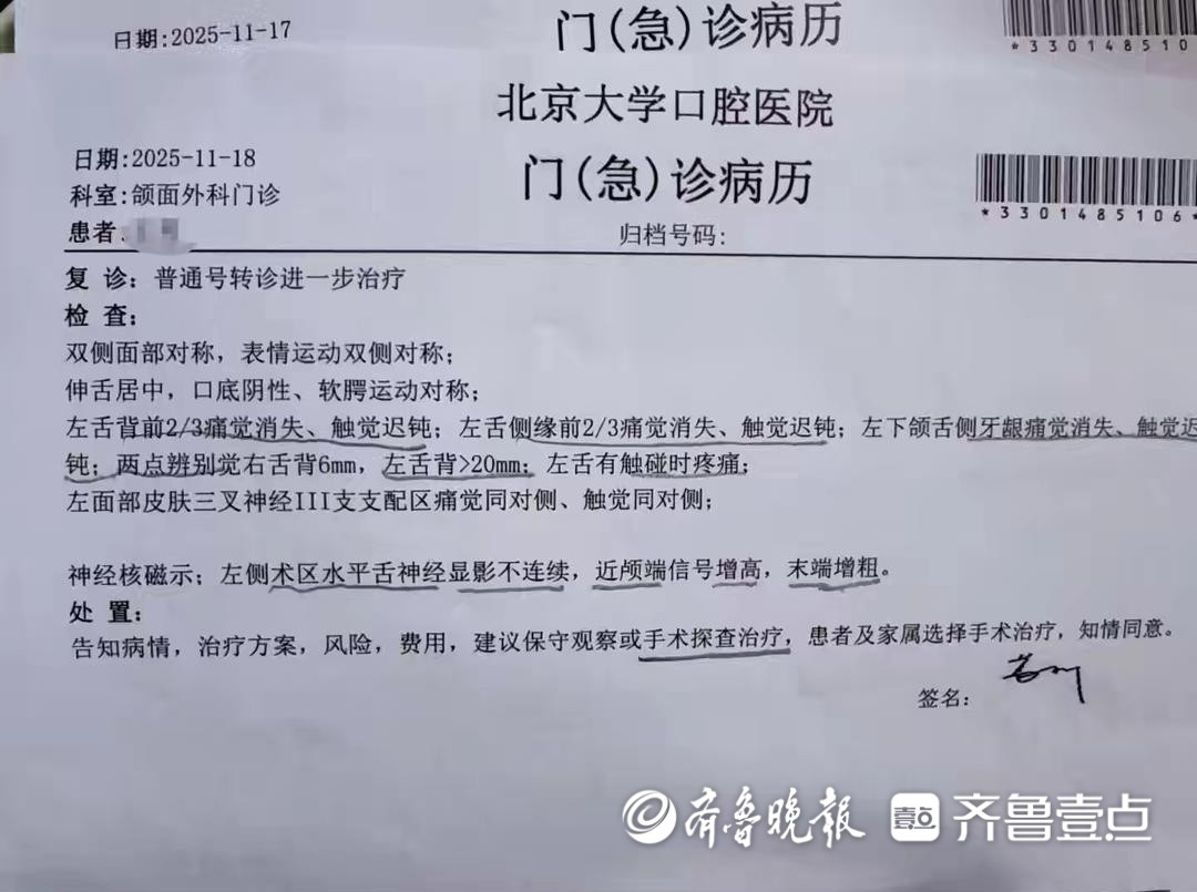 在术后半个月的时间里,王女士为智齿以及没有知觉的舌头辗转国内多地知名医院就医,均无好转。2025年11月17日,王女士赶赴北京大学口腔医院就诊,该院出具的报告显示“左舌神经损伤”,几天后进行了“舌神经修复手术”。