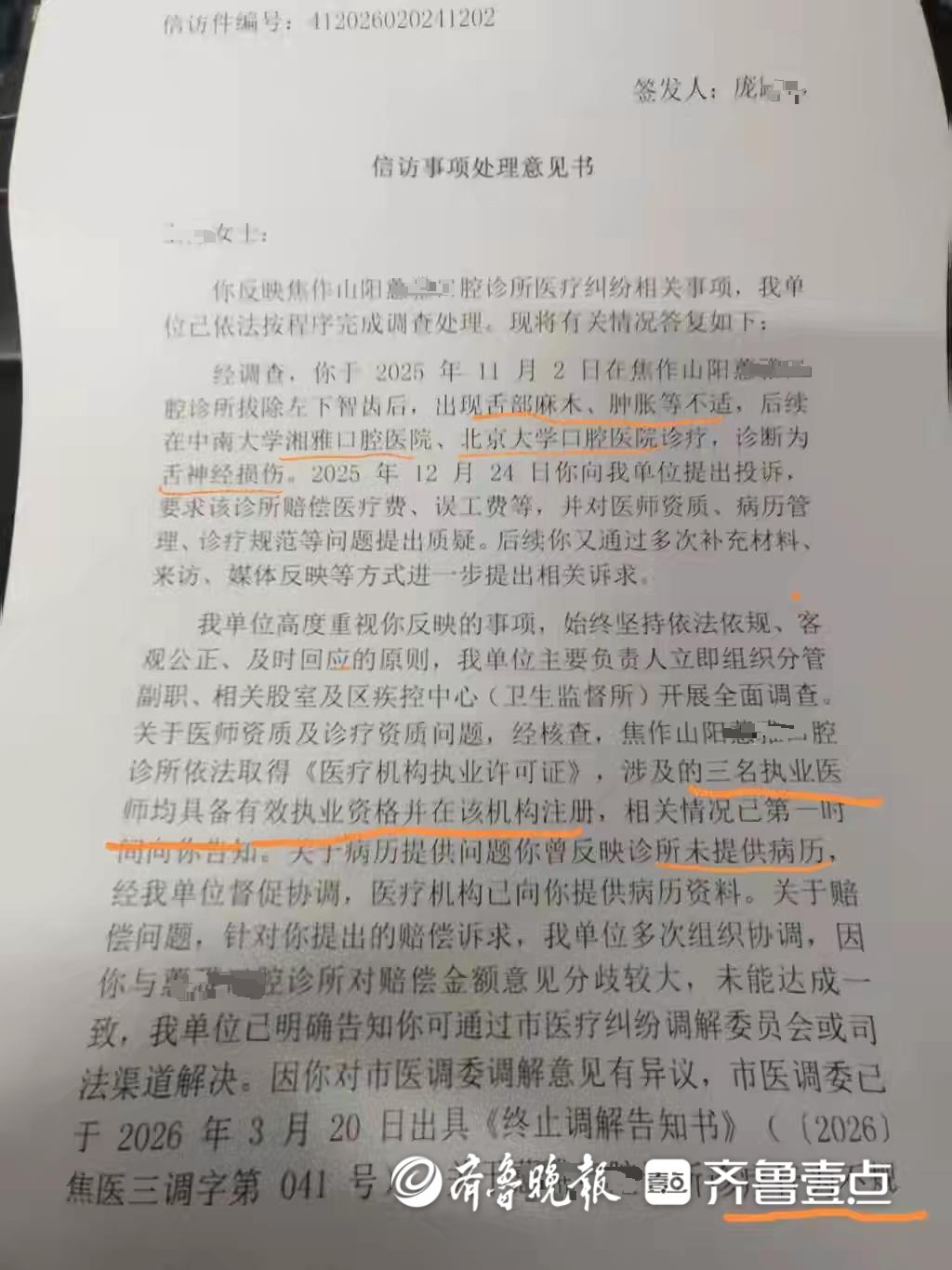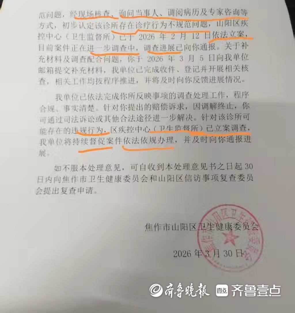 随后,齐鲁晚报·齐鲁壹点记者致电焦作市山阳区卫健委,一名庞姓工作人员表示确有此事,并且已于2025年11月介入。经过相关工作人员的调查后发现,涉事诊所在给王女士治疗过程中,确实存在违反医疗规范的行为,例如没有提前告知手术风险以及病历书写不规范等,区卫健委2月份已对此立案,对涉事诊所进行了查处,且于3月30日对王女士送达了一份《信访事项处理意见书》,上面明确说明了事情原委以及区卫健委对涉事口腔诊所的处理结果。