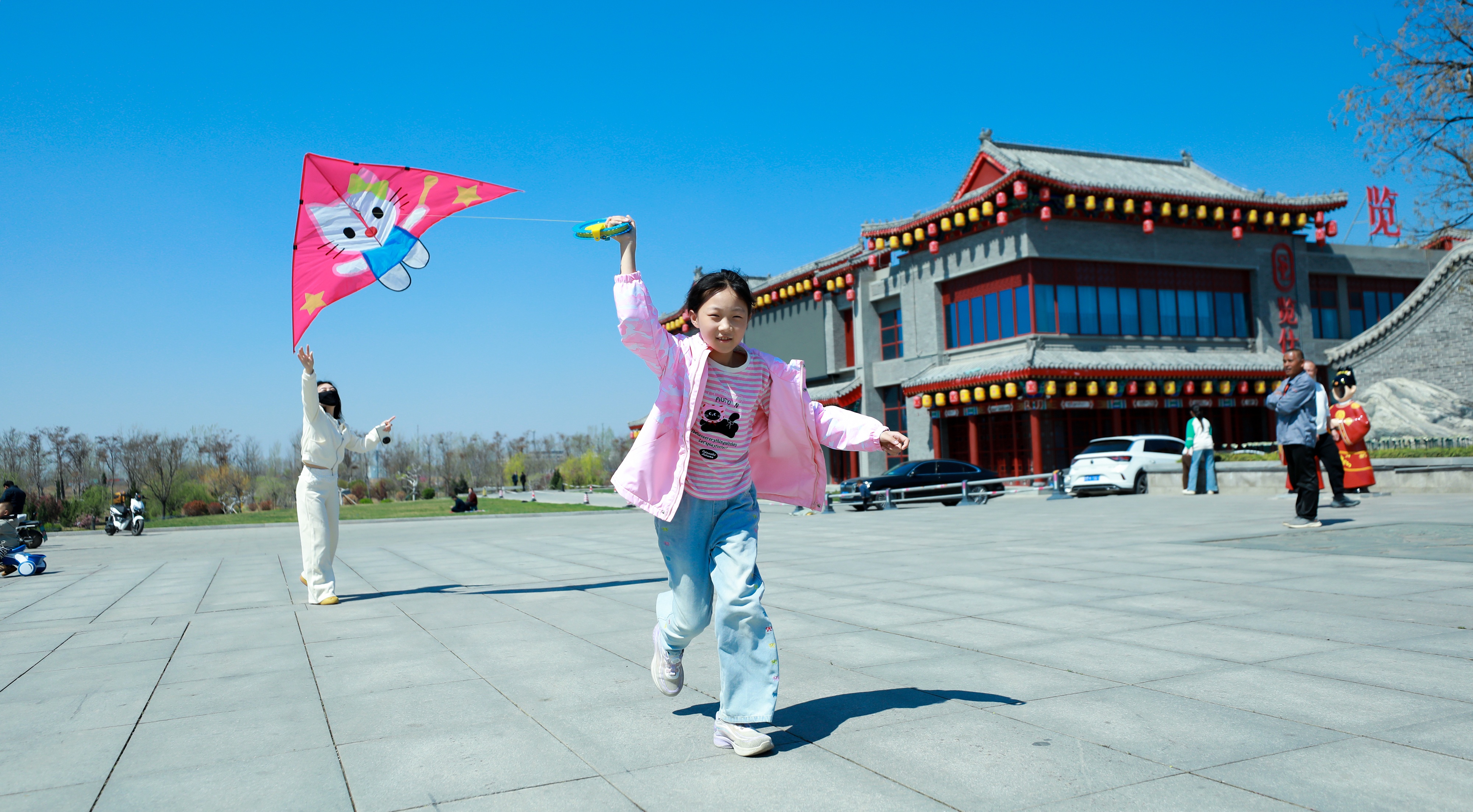 近日,在无棣古城的齐鲁民俗馆前广场,一名小朋友正在放风筝。春和景明,万物复苏,市民们纷纷来到户外踏青休闲,享受春天的美好。(大众新闻记者 程芃芃 通讯员 杨景成)