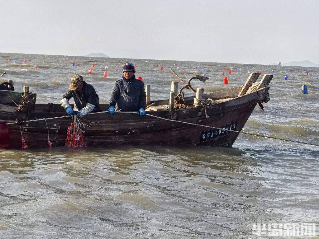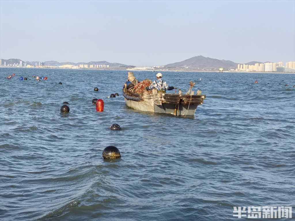 4月8日早晨6时许,海上依然寒风刺骨,出海的人需要穿着厚厚的羽绒服。今年28岁的崔志昊早已起床,坐上小船,跟着师傅一起查看撒苗的进度。