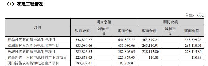 宁德时代2022年年报显示,新能安成立当年就开始自建产能,在建工厂账面价值超18亿元。厦门新能安锂离子电池生产基地项目总投资200亿元,总用地面积2500亩共分三期建设。一期工程用地900亩,规划产能12GWh,2023年2月第一条生产线投入试生产,同年年底实现全面投产。二期工程于2024年1月开工,规划产能18GWh,用地780亩,计划总投资100亿元。二期二阶段计划于2026年3月开工,计划总投资57亿元,新增产能约9GWh。