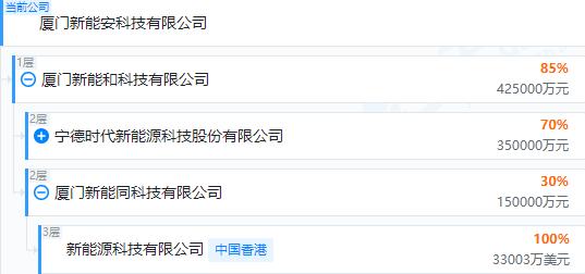 天眼查APP显示,新能安成立于2021年7月,注册资本为50亿元,控股股东厦门新能和科技有限公司持股85%。宁德时代持有厦门新能和科技有限公司70%的股份,ATL通过全资子公司持有剩余30%的股份。