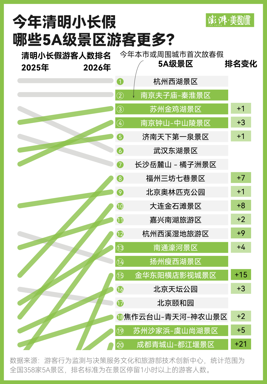 排名涨幅最大的分别是成都青城山-都江堰景区和金华东阳横店影视城景区,排名上升21位和15位,这两个城市均在四月初首次放春假。