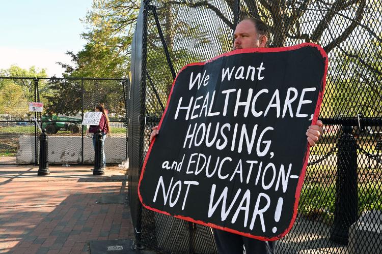 4月7日,人们在美国首都华盛顿的白宫前示威。新华社记者李睿摄