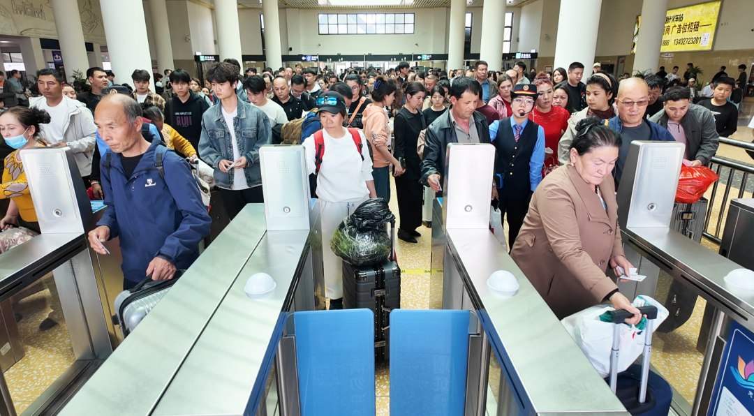 喀什火车站旅客正在通过检票闸机 。喀什地区融媒体中心 记者依力夏提 摄