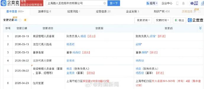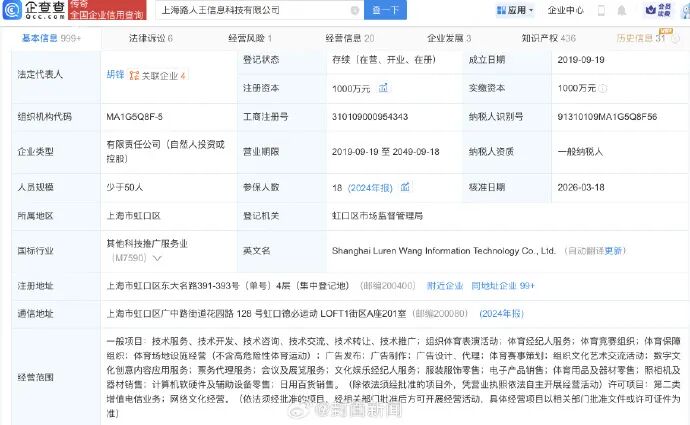 企查查App显示,“路人王”运营公司上海路人王信息科技有限公司成立于2019年9月,注册资本1000万元,经营范围含体育经纪人服务、体育竞赛组织、体育保障组织等。2026年3月,该公司法定代表人、董事、财务负责人均发生变更。