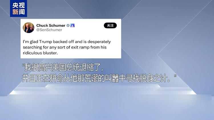 就在特朗普宣布停火之后,美国参议院民主党领袖查克·舒默表示:“我很高兴美国总统退缩了,并且正在拼命从他那荒谬的叫嚣中寻找脱身之计。”