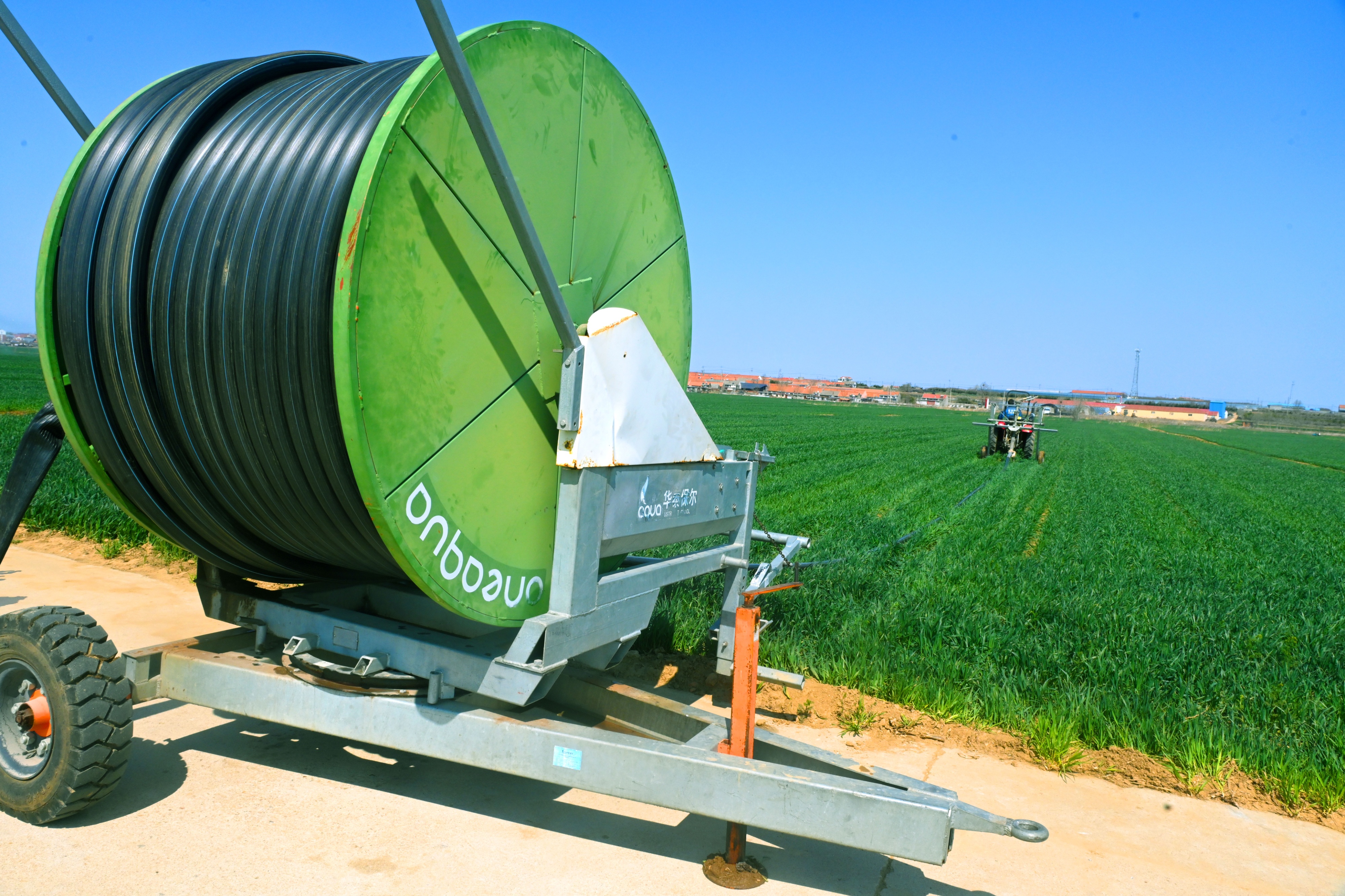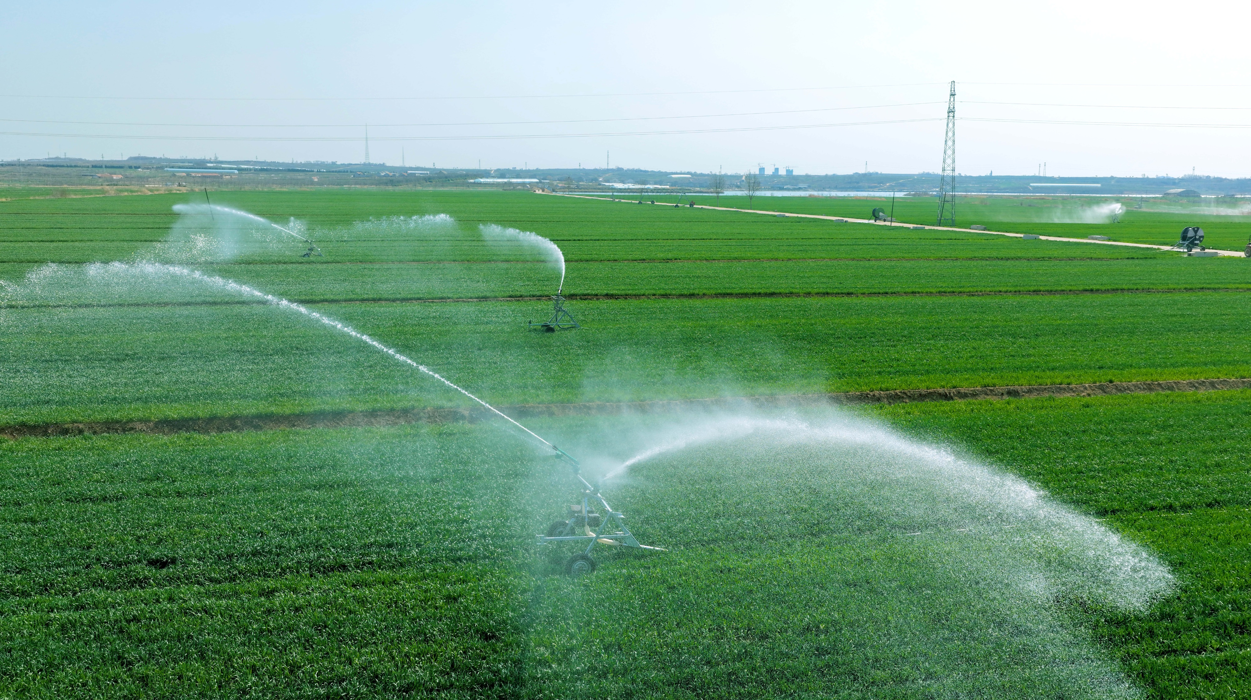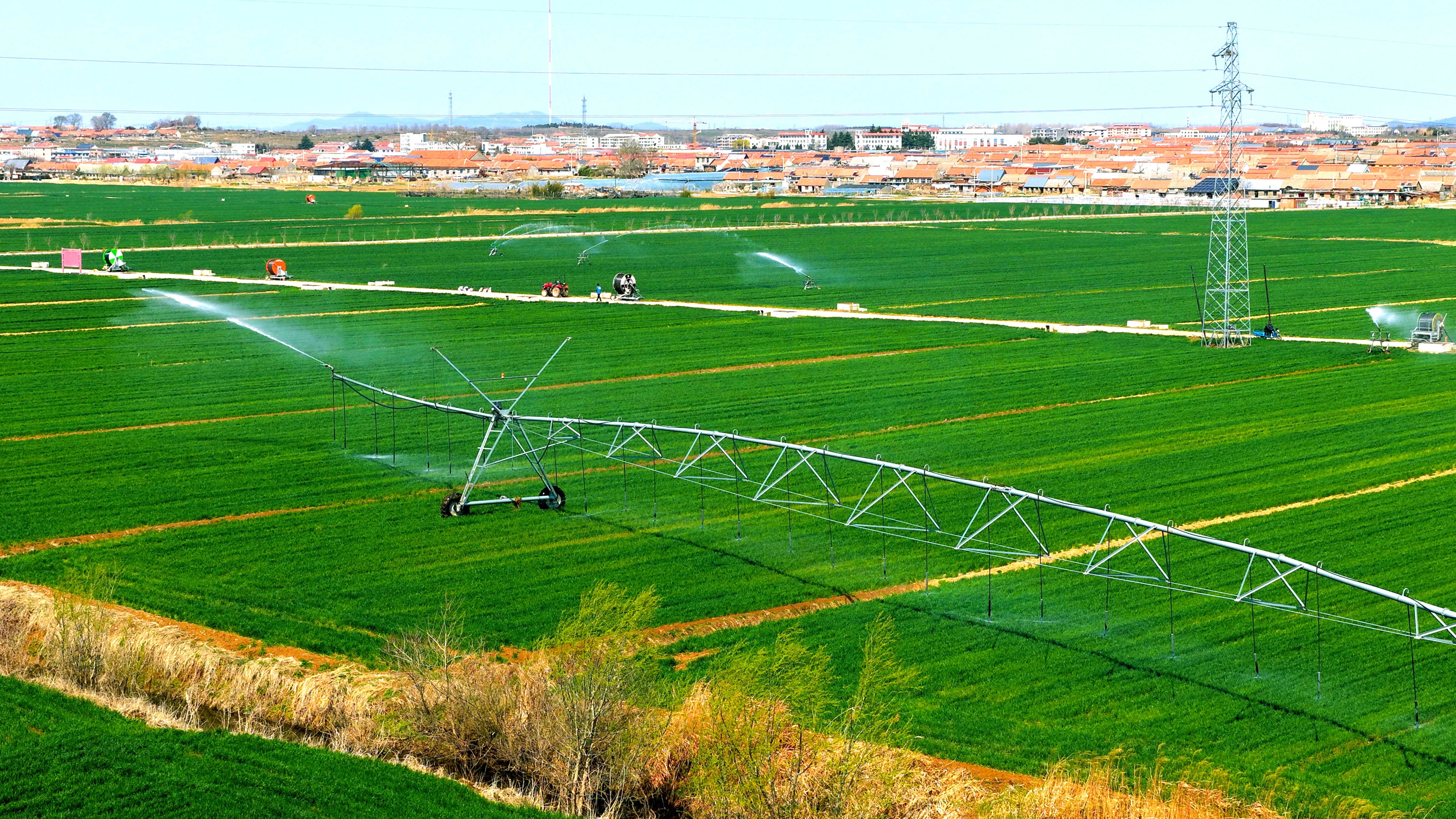 4月8日,在荣成市滕家镇一处麦田,农民正在利用大型喷灌设备给冬小麦喷灌返青水。冬小麦苗全苗壮,长势喜人。荣成市滕家镇是内陆农业镇。近年来,滕家镇加大节水型农业推广力度,逐步改变传统农业大水漫灌的种植方式,投资配备指针式喷灌机、卷盘式喷灌机等高效灌溉设备,比传统灌溉方式节约用水三成以上。(大众新闻记者陶相银通讯员杨志礼)
