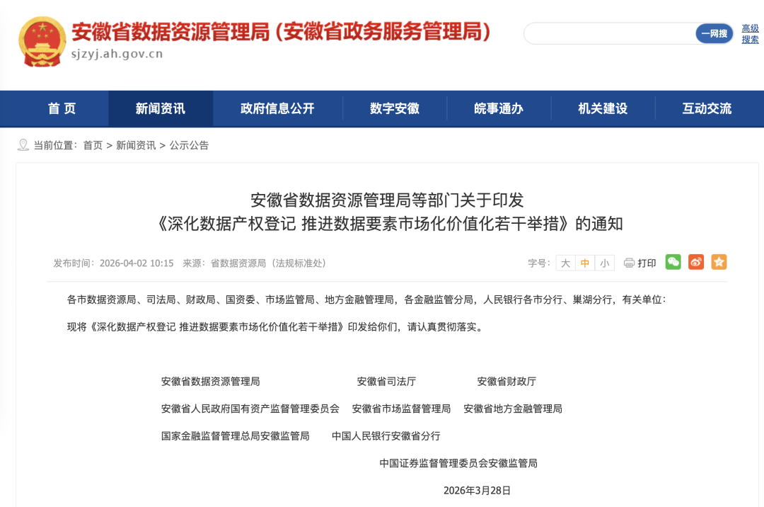 4月2日,安徽省数据资源管理局、安徽省司法厅、安徽省财政厅、安徽省人民政府国有资产监督管理委员会 安徽省市场监督管理局、安徽省地方金融管理局、国家金融监督管理总局安徽监管局、中国人民银行安徽省分行、中国证券监督管理委员会安徽监管局印发《深化数据产权登记 推进数据要素市场化价值化若干举措》(以下简称《措施》)。