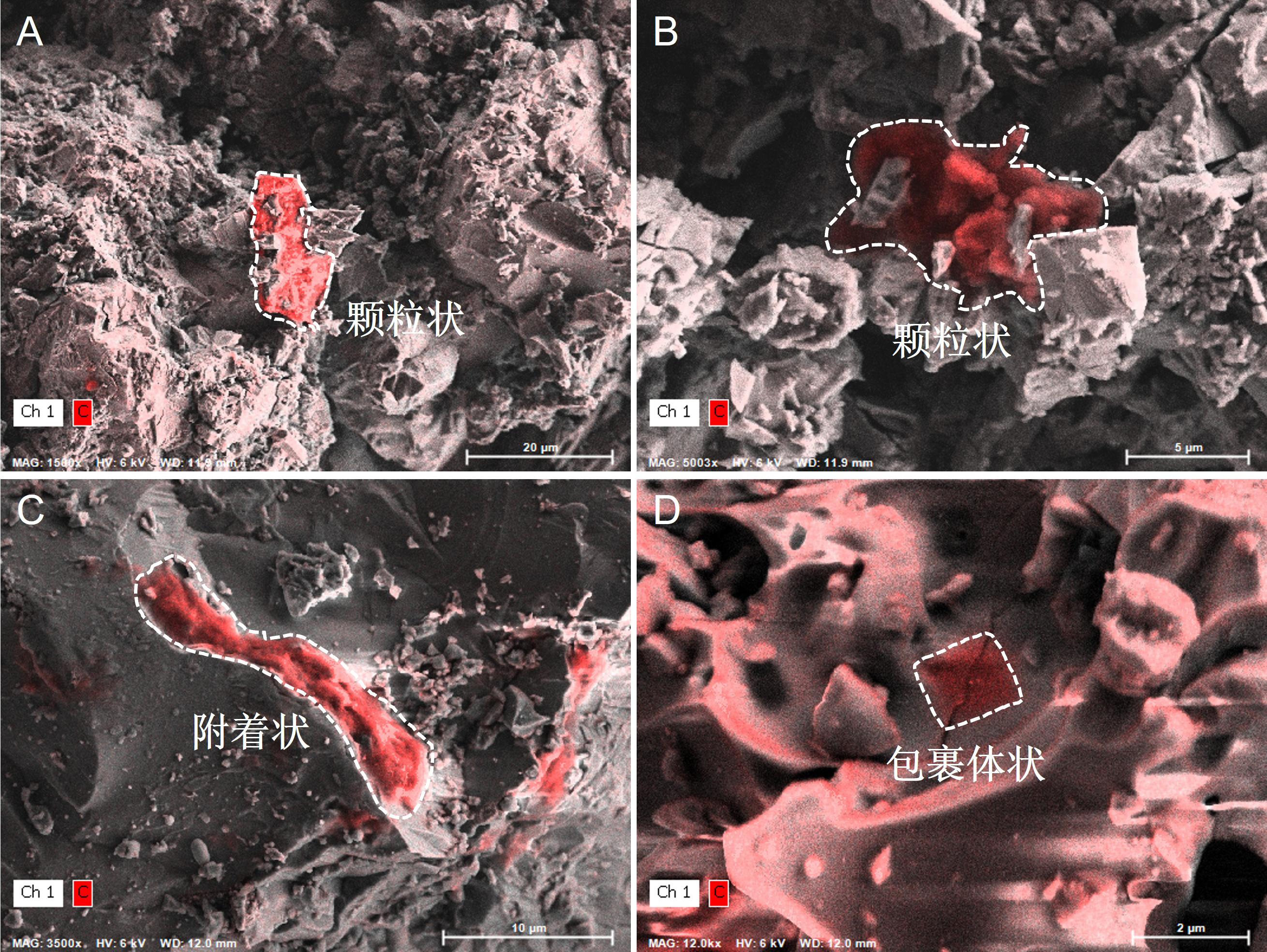 嫦娥六号(A-B)和嫦娥五号(C-D)月壤中的代表性有机质,图为扫描电镜二次电子像叠加碳元素能谱图。