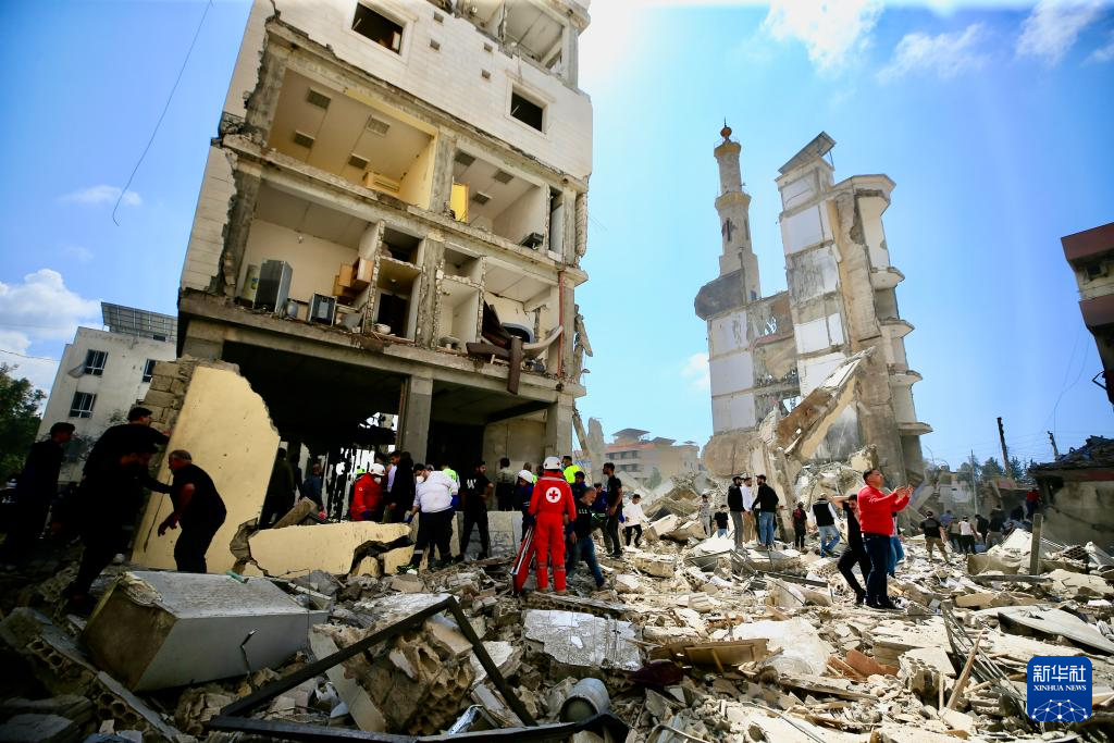 8日,在黎巴嫩南部西顿市,救援人员在以军空袭损毁的建筑废墟中寻找生还者。