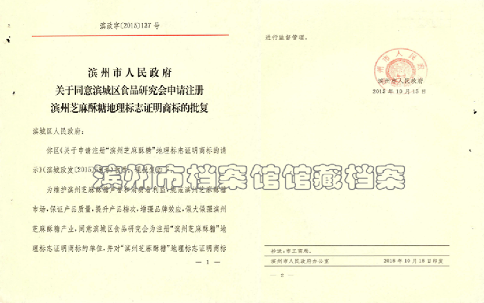 本次公布的档案史料来源于滨州市档案馆馆藏滨州市人民政府办公室全宗,文件制发机关为滨州市人民政府办公室,文件形成时间为2015年10月15日,题名为《滨州市人民政府关于同意滨城区食品研究会申请注册滨州芝麻酥糖地理标志证明商标的批复》。文件内容是滨州市人民政府批复同意滨城区食品研究会申请注册 滨州芝麻酥糖地理标志证明商标。