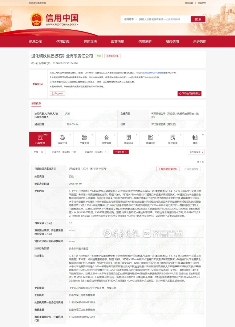通化钢铁板石矿业因存在多项安全生产违法违规行为被罚3.5万元