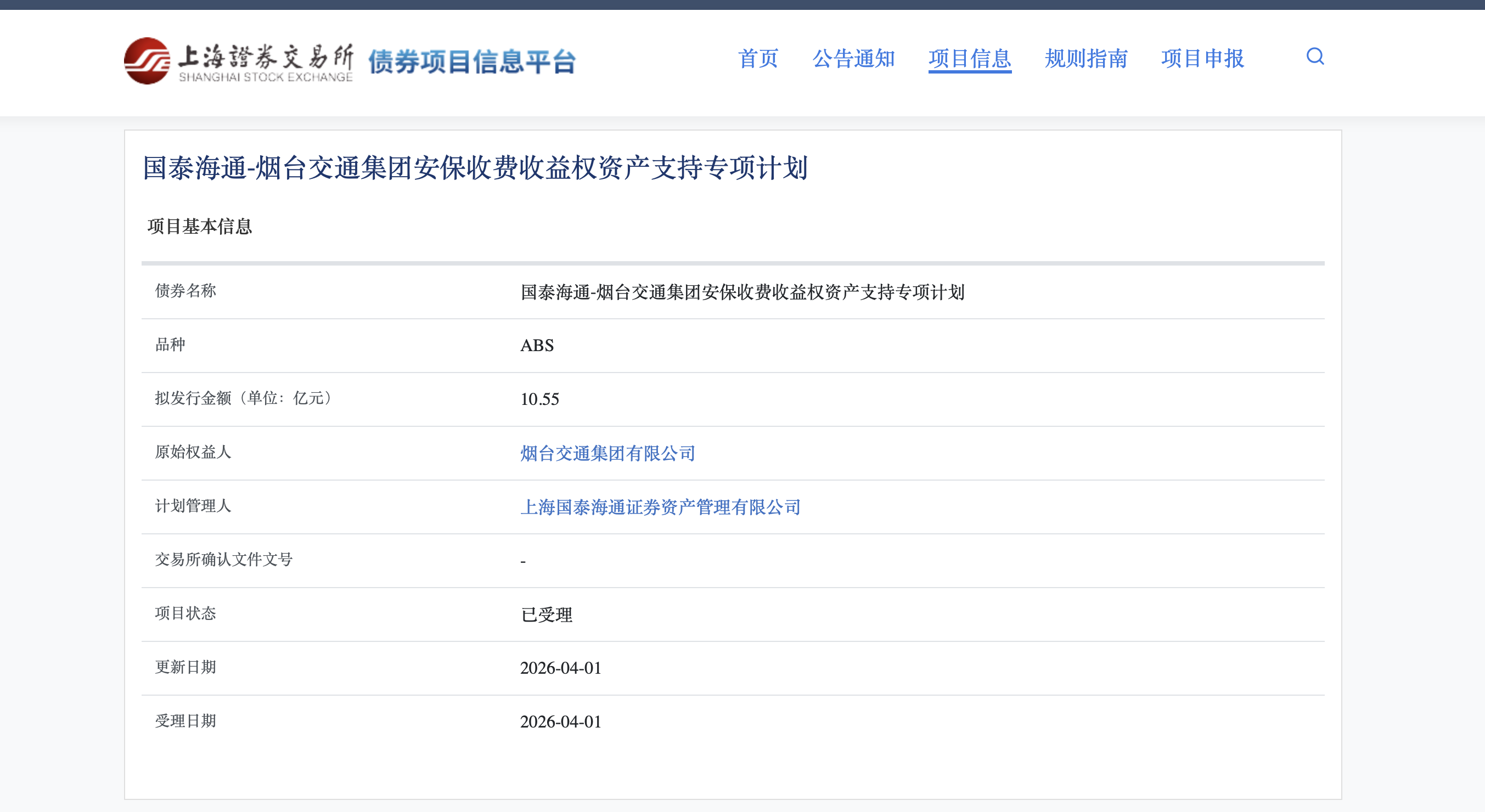 上交所债券项目信息平台显示,4月1日,“国泰海通-烟台交通集团安保收费收益权资产支持专项计划”项目状态更新为“已受理”。该项目为资产支持证券(ABS),拟发行总金额10.55亿元,发行主体为烟台交通集团,计划管理人为上海国泰海通证券资产管理有限公司。