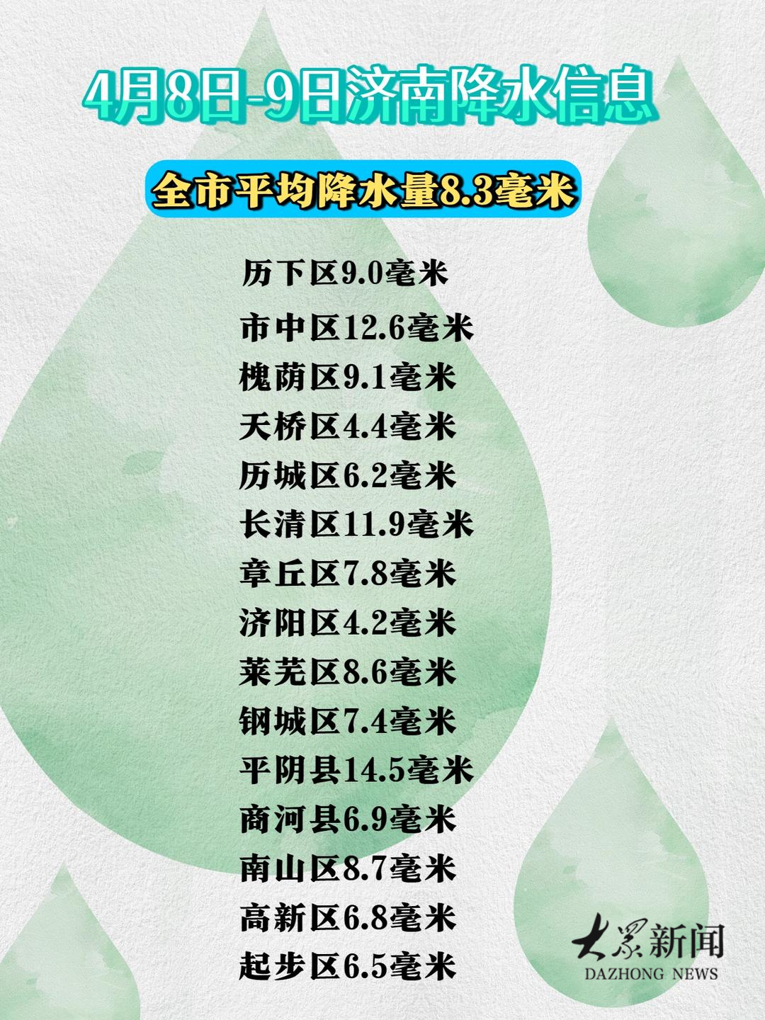 一场春雨一场暖。4月9日早上,济南雨水情信息系统发布24小时雨量 (时间段为04-08 09:50:31---04-09 09:50:31 )。系统信息显示,全市平均降水量为8.3毫米。其中,历下区9毫米,市中区12.6毫米,槐荫区9.1毫米,天桥区4.4毫米,历城区6.2毫米,长清区11.9毫米,章丘区7.8毫米,济阳区4.2毫米,莱芜区8.6毫米,钢城区7.4毫米,平阴县14.5毫米,商河县6.9毫米,南山区8.7毫米,高新区6.8毫米,起步区6.5毫米。全市前三位降水点:展小庄24毫米,刁山坡 23.5毫米,李沟 22.5毫米。