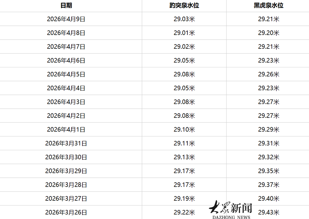 春雨贵如油!4月9日上午,趵突泉水位达到29.03米,比4月8日上升了0.02米。而在此之前,趵突泉水位自4月5日以来已经连续“三连跌”。值得一提的是,在清明节前的4月3日下午的一场春雨,也使得趵突泉水位实现了回升,从29.05米回升至29.08米,此后水位持续下降至本次降雨。黑虎泉水位与趵突泉水位涨跌幅度近乎同步。每年春天,济南市民都要为趵突泉担忧。这两场春雨对于济南泉水补给作用也非常大,也有利于缓解泉水水位下降的趋势。