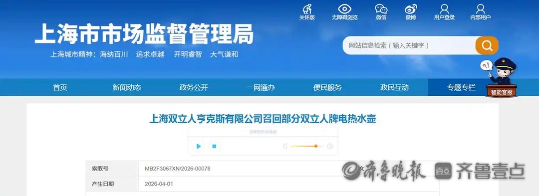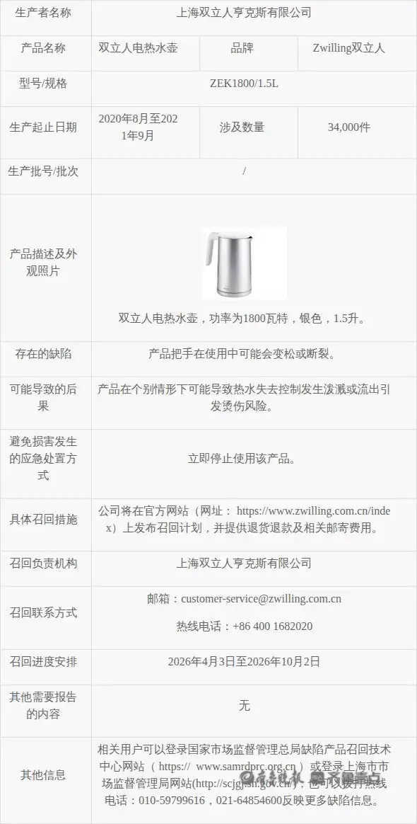 上海市市场监管局于2026年4月3日发布通告,上海双立人亨克斯有限公司主动召回部分批次双立人牌电热水壶。此次召回涉及产品存在接地措施不符合国家标准、温控器防护不到位等电气安全风险,可能引发触电或过热隐患。企业已向监管部门提交召回计划,自即日起停止销售相关批次产品,并通过官网、销售终端等渠道发布召回信息,督促消费者退回问题产品。市场监管部门将持续跟踪召回实施情况。消费者如持有相关批次产品,建议立即停用并联系企业办理退换。