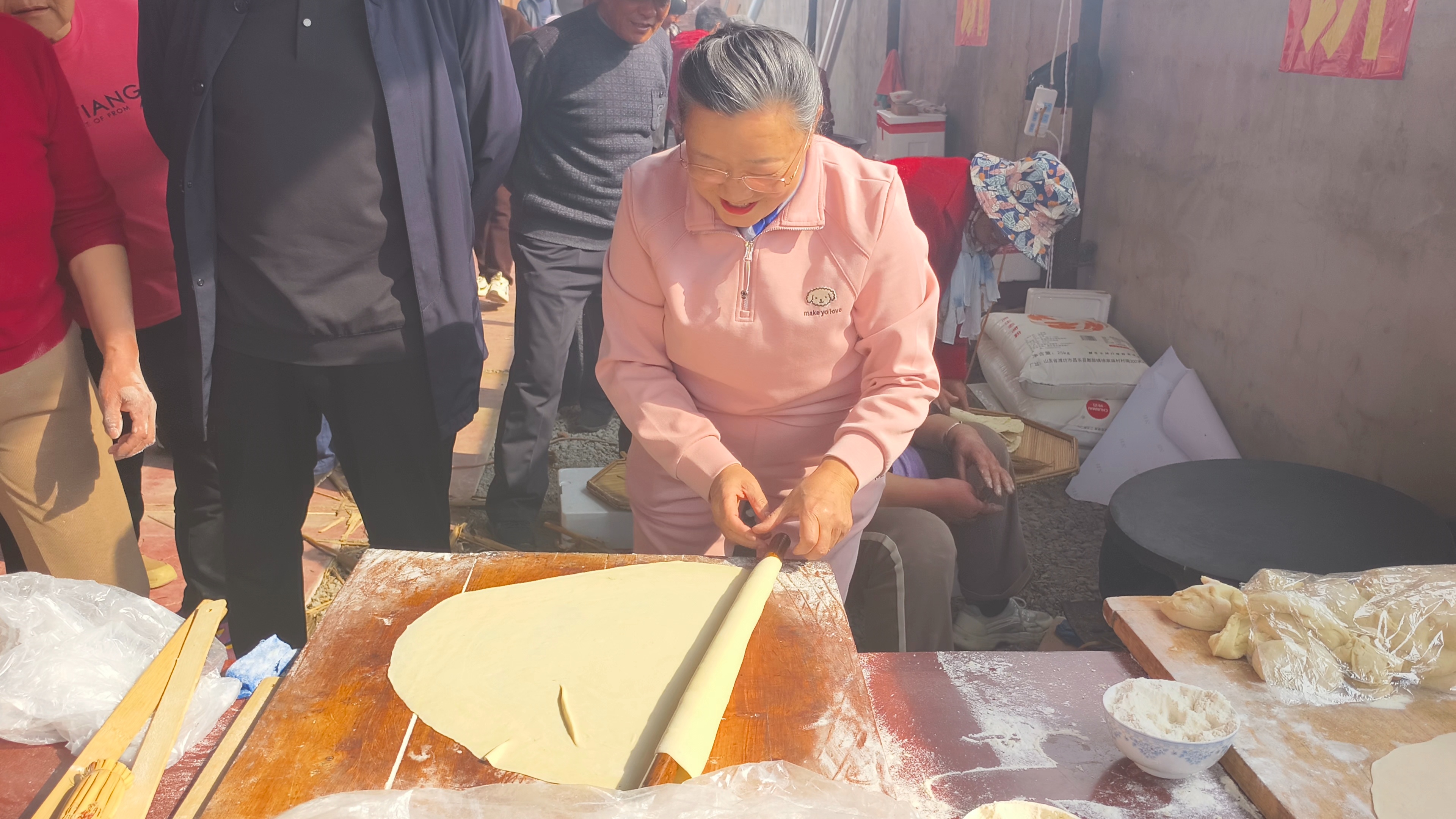 活动现场,杜延芬撸起袖子加入擀饼队伍,她和乡亲们围在案板前,揉面、揪剂子、擀薄饼,一边忙活一边拉家常。“这饼要擀得圆,日子才过得团团圆圆。”她学着大娘的手势,擀出的饼虽不太规整,却惹得一片欢笑。灶火映红了大家的脸,一张张薄饼出锅,卷上大葱和酱,咬一口,满是家乡的味道。