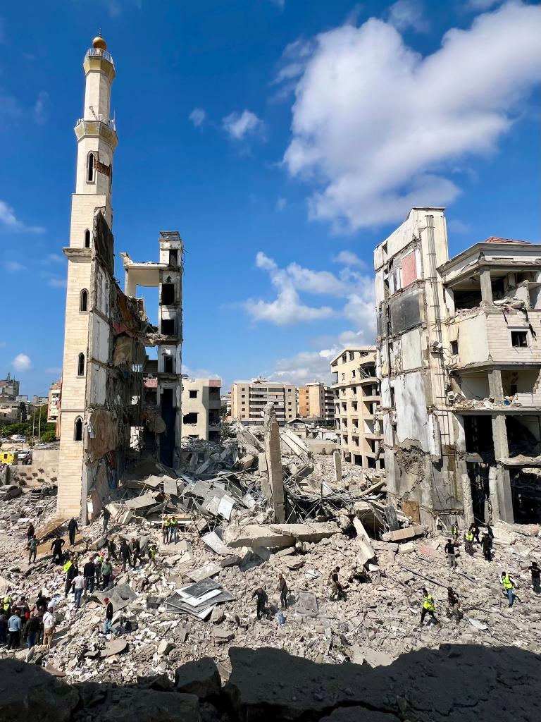 4月8日,在黎巴嫩南部西顿市,救援人员在以军空袭损毁的建筑废墟中寻找生还者。新华社发(阿里·哈希绍摄)