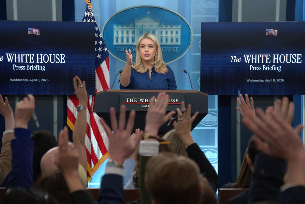 4月8日,在美国首都华盛顿白宫,白宫新闻秘书莱维特出席记者会。新华社发(李源清摄)