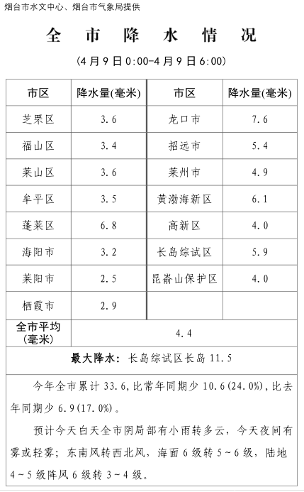 4月9日0时至6时,烟台最大降水11.5毫米,出现在长岛