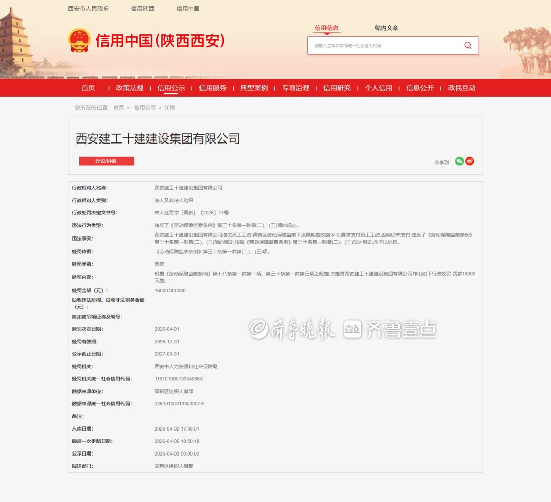 近日,西安市人力资源和社会保障局发布行政处罚决定,西安建工十建建设集团有限公司因拖欠员工工资且逾期未按要求支付,被依法处以罚款1.6万元。
