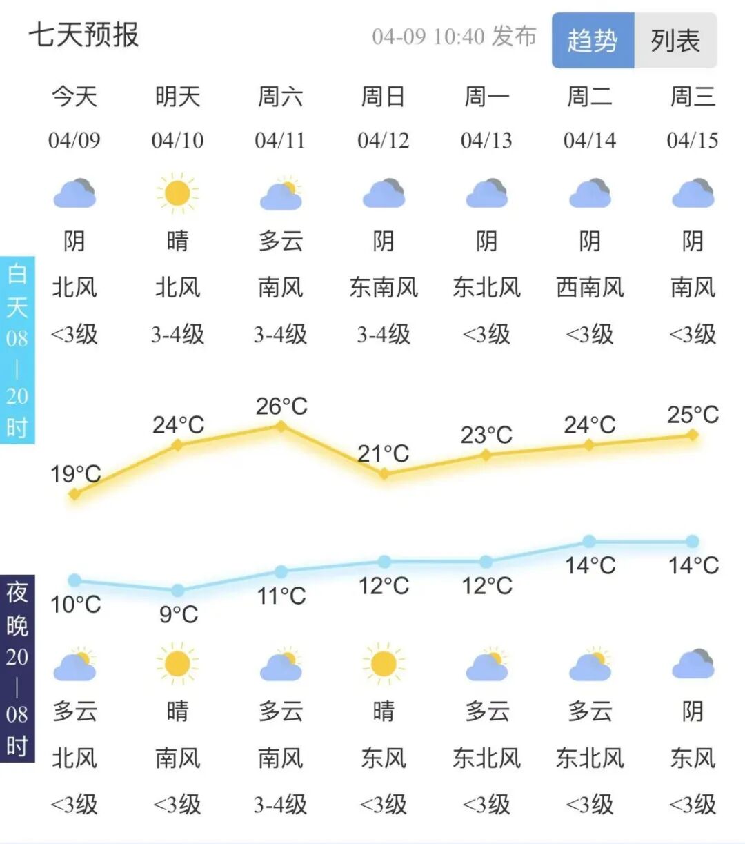 4月10日白天到夜间,晴到少云,北风3到4级转南风2到3级,湖面3到4级,最低气温9°C左右,最高气温24°C左右。
