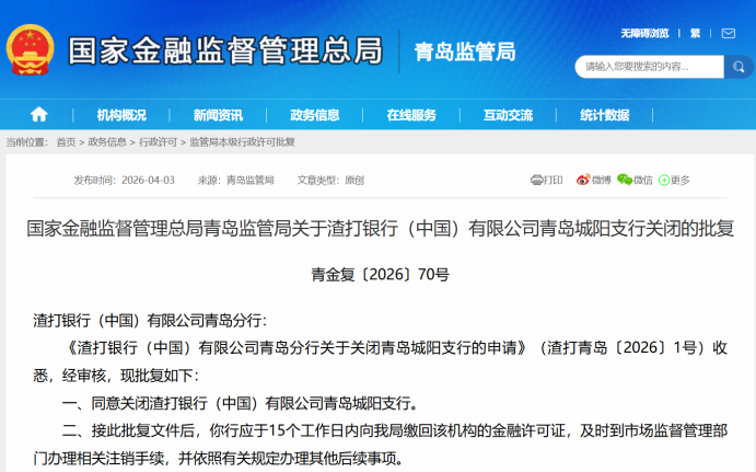 4月3日,国家金融监督管理总局青岛监管局官网公示的行政许可信息(青金复〔2026〕70号)显示,经审核,该局同意关闭渣打银行(中国)有限公司青岛城阳支行。该批复还显示,接此批复文件后,渣打银行(中国)有限公司青岛分行应于15个工作日内向该局缴回该机构的金融许可证,及时到市场监督管理部门办理相关注销手续,并依照有关规定办理其他后续事项。