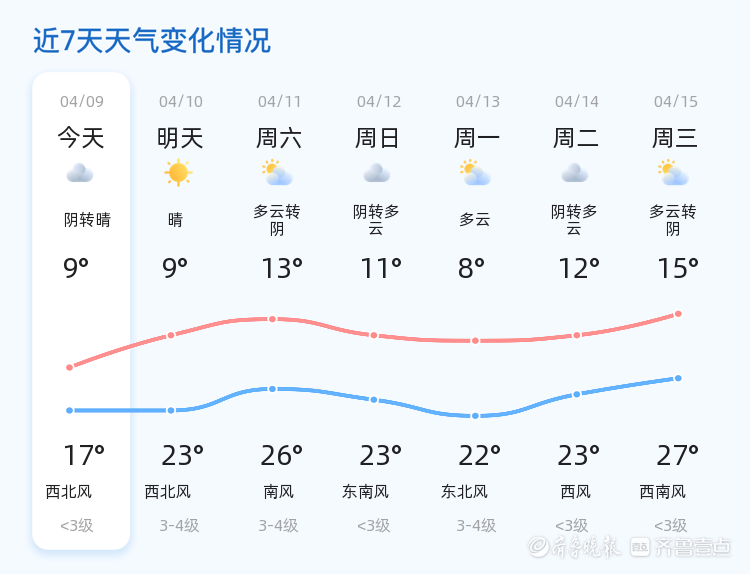 明日(4月10日),淄博市天气将转为晴朗,气温较今日有显著回升,最高气温将达到23℃,最低气温为9℃,风力增强至3-4级,市民需注意防风保暖。
