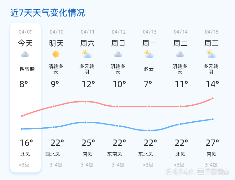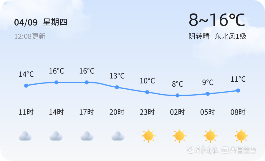 今天是4月9日,星期四,农历二月廿二。潍坊市今日天气阴转晴,气温在8℃到16℃之间,东北风1级,空气湿度为86%,PM2.5指数为28,空气质量良好。各区天气情况总体平稳,市民出行时建议携带雨具,以备不时之需。